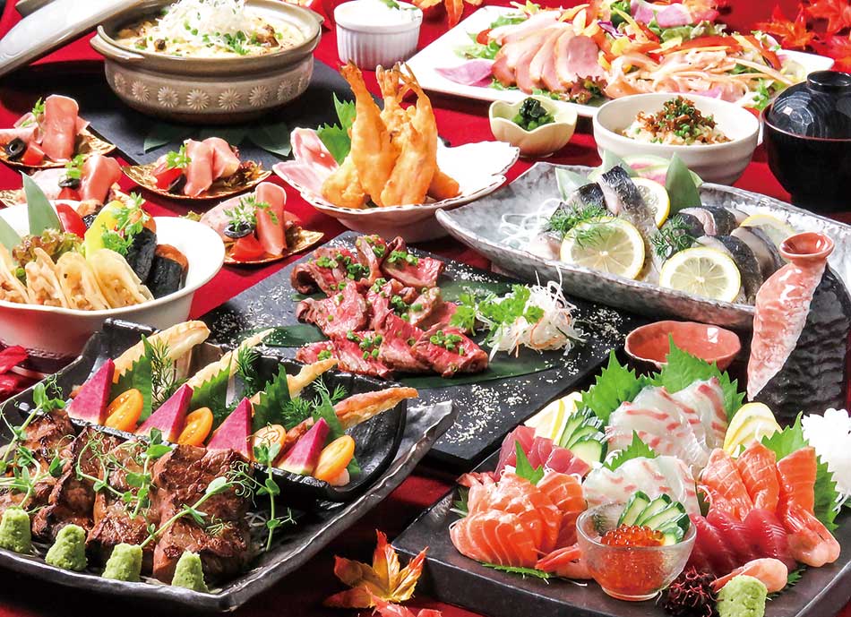 完全個室で楽しめる「Wメインコース」は前菜やサラダ、市場直送の鮮魚刺身盛りに加え、カニクリームコロッケ とろとろチーズがけ、マグロのスパイスまみれ ミディアムソテーなど満足度の高いコースが並ぶ。メインは、はりはり鍋風の国産豚バラしゃぶしゃぶと、赤ワインソースで味わう国産牛モモ肉のローストの豪華2種。〆の蕎麦とデザート、120分飲み放題までついた全11品6000円!個室は2名〜最大30名まで対応。前日までの完全予約制。